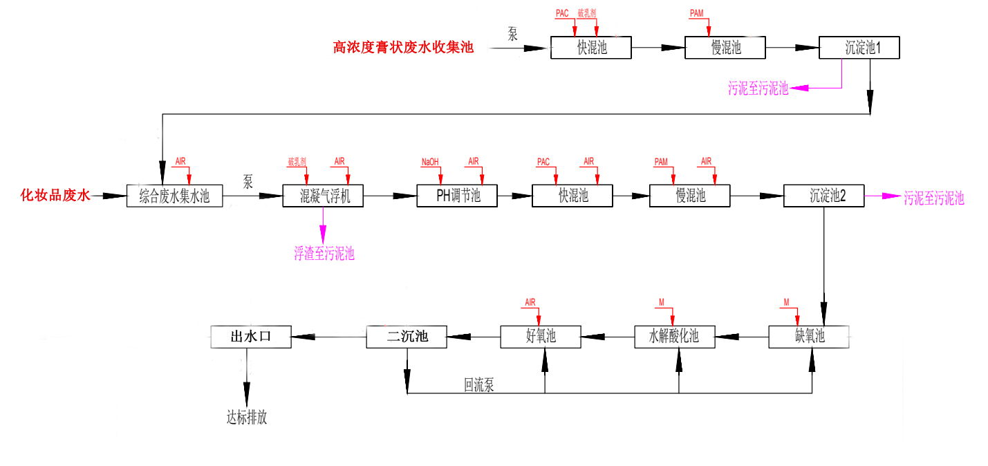 化妝品廢水的基礎潤膚原料主要分為植物油類、蠟類、烴類、合成油脂和脂肪酸、脂肪醇和脂類。此外,還含有乳化劑、增稠劑、抗氧化劑、防腐殺菌劑和香精色素等。根據化妝品廢水特性我司自主研發了破乳劑R016,針對高濃度膏狀化妝品廢水破乳效果極佳。R016破乳劑將廢水中乳化油、膠體凝聚而分離沉淀;有效的除油、脫色、高效去除COD,一次完成破乳同混凝過程。R016性能優,破乳速度極快,可完全去除油類膠質,在水中礬花大,沉降速度快,脫色率大于90%,COD去除率極高,且污泥量小。R016破乳劑同時用于高濃度乳化液廢水效果比R015的效果好。
